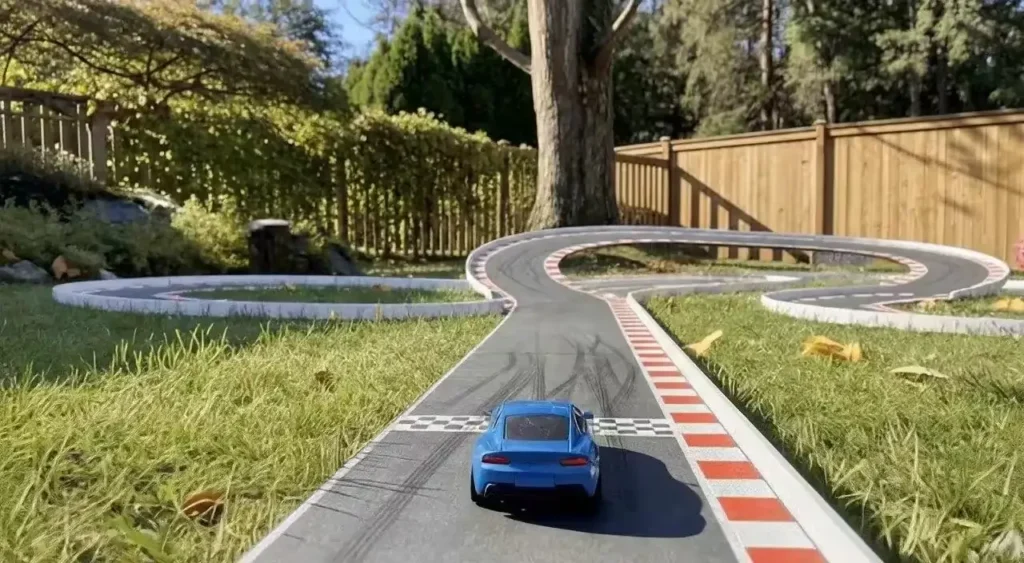 - Voiture de Jouet sur une Piste dans un Jardin : Une course simple mais ultra-réaliste dans un backyard.
